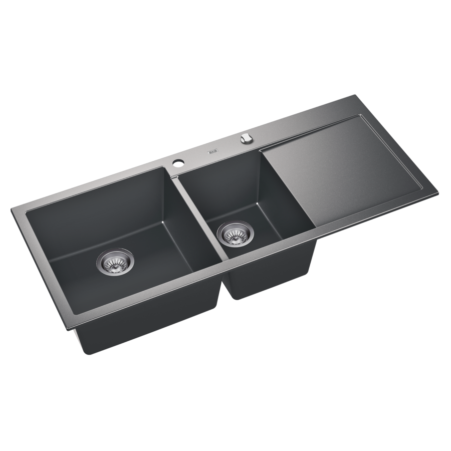 A-POINT 180 kétmedencés csepegtetőtálcás kivitelben, extra mély medencével, fekete-szemcsés, fekete, bézs, fehér és szürke színekben. Balos kivitelben használható. Az A-POINT 180 kétmedencés csepptálcás min. 80 cm széles szekrénybe építhető be.