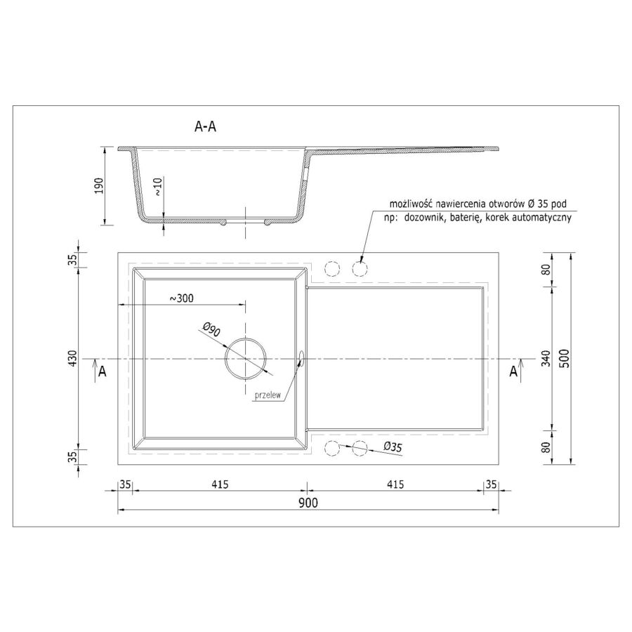 ALEX egymedencés csepptálcás gránit mosogató, csepptálcás kivitelben, extra mély medencével, fekete-szemcsés, fekete, bézs, fehér és szürke színekben. Jobbos és balos kivitelben is használható. Az ALEX egymedencés csepptálcás gránit mosogató min. 55 cm széles szekrénybe építhető be.
