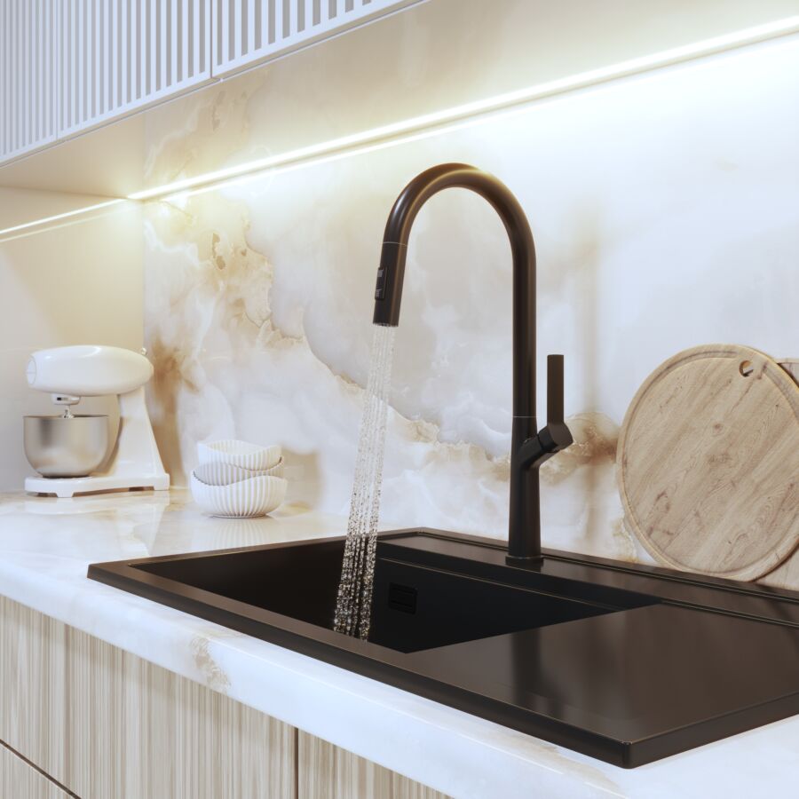 Az Awra konyhai csaptelep kihúzható kifolyóval és kettős funkciójú kézi szeleppel a modern dizájnt és a funkcionalitást ötvözi, hogy leegyszerűsítse a mindennapi konyhai feladatokat. A rugalmas, kihúzható kifolyóval ellátott vízsugár könnyen irányítható, így különösen hasznos nagy edények megtöltéséhez, zöldségek öblítéséhez vagy a mosogató tisztításához.