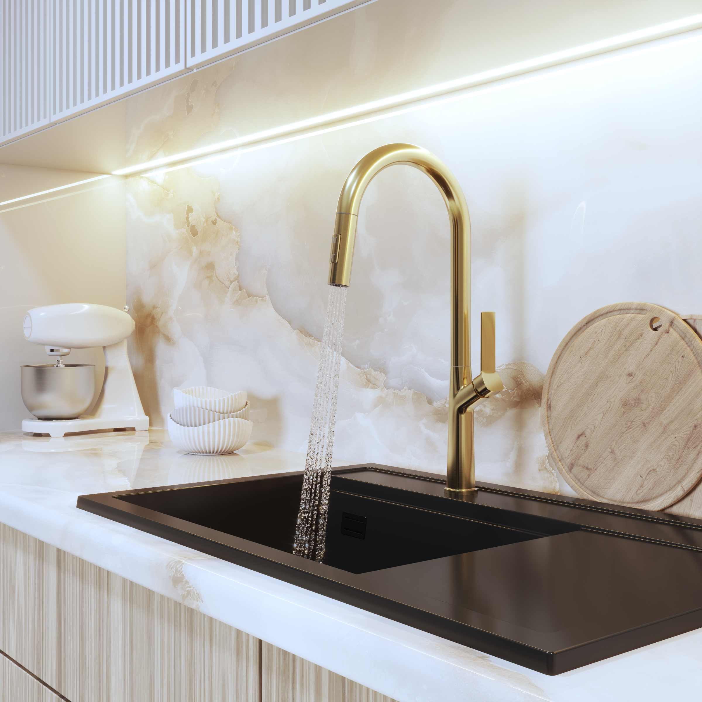 Az Awra konyhai csaptelep kihúzható kifolyóval és kettős funkciójú kézi szeleppel a modern dizájnt és a funkcionalitást ötvözi, hogy leegyszerűsítse a mindennapi konyhai feladatokat. A rugalmas, kihúzható kifolyóval ellátott vízsugár könnyen irányítható, így különösen hasznos nagy edények megtöltéséhez, zöldségek öblítéséhez vagy a mosogató tisztításához.