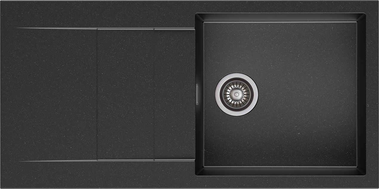 CASCADA 100 egymedencés gránit mosogató csepptálcás kivitelben, extra mély medencével, fekete-szemcsés, fekete, bézs, fehér és szürke színekben. Jobbos és balos kivitelben is használható. A CASCADA 100 egymedencés gránit mosogató csepegtető tálcával min. 60 cm széles szekrénybe építhető be.