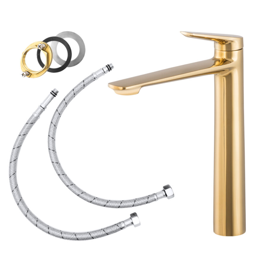 Elva magasított mosdó csaptelep vízesés alakú vízsugárral arany, beépíthető