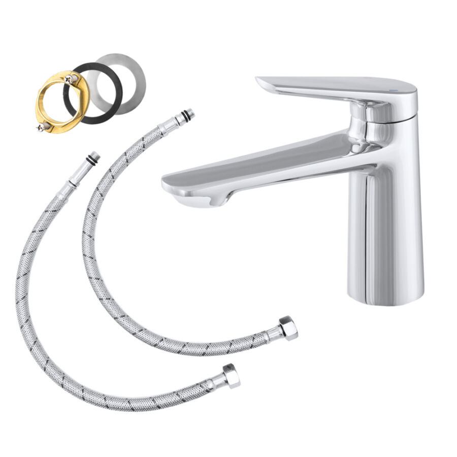 A csomag tartalma: csaptelep, bekötő csövek, tömítések, minden szerelvény, ami a bekötéshez szükséges