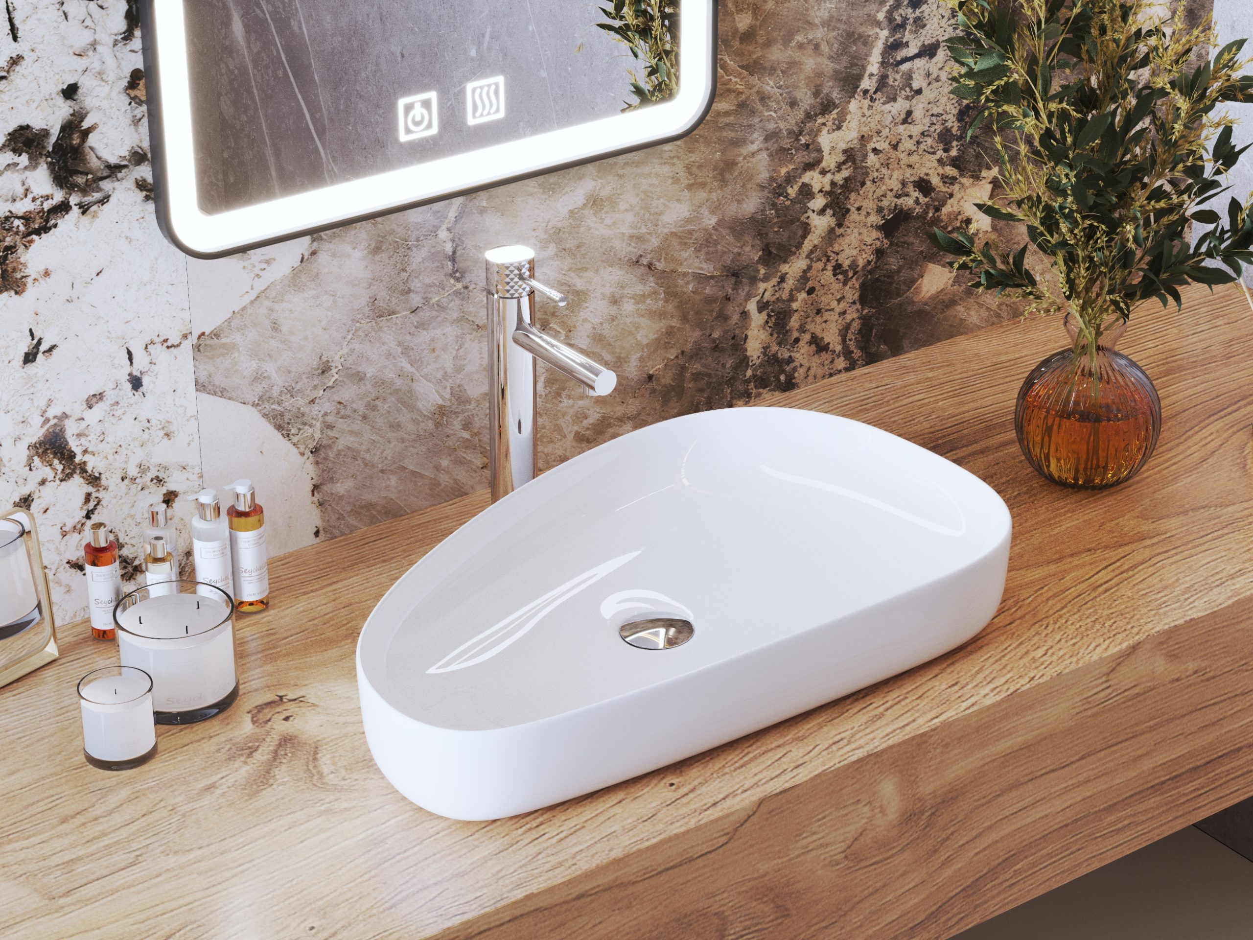 A Gamma Elia munkalapra helyezhető ovális mosdótál, amely illeszkedik a modern belsőépítészeti trendekhez. A munkalapra helyezve a fürdőszoba központi dekorációja lesz, különösen azért, mert érdekes formájával vonzza a figyelmet. A Gamma Elia ovális mosdótál, mérete 610x415mm. Mélysége 155 mm, így a víz nem fröccsen a munkalapra a mindennapi higiéniai tevékenységek során. A Gamma Elia ovális mosdó, fehér színben tökéletes a modern és hagyományos fürdőszobákhoz is.