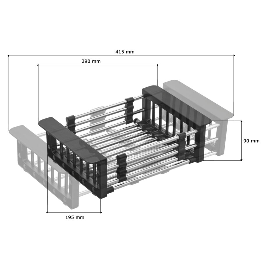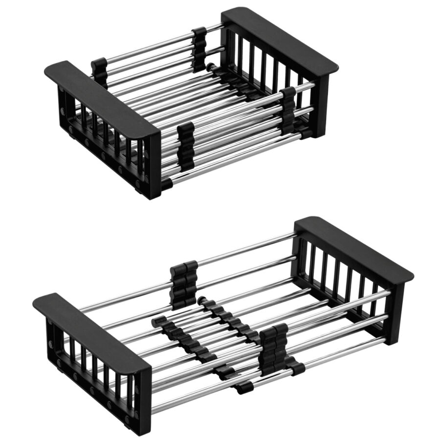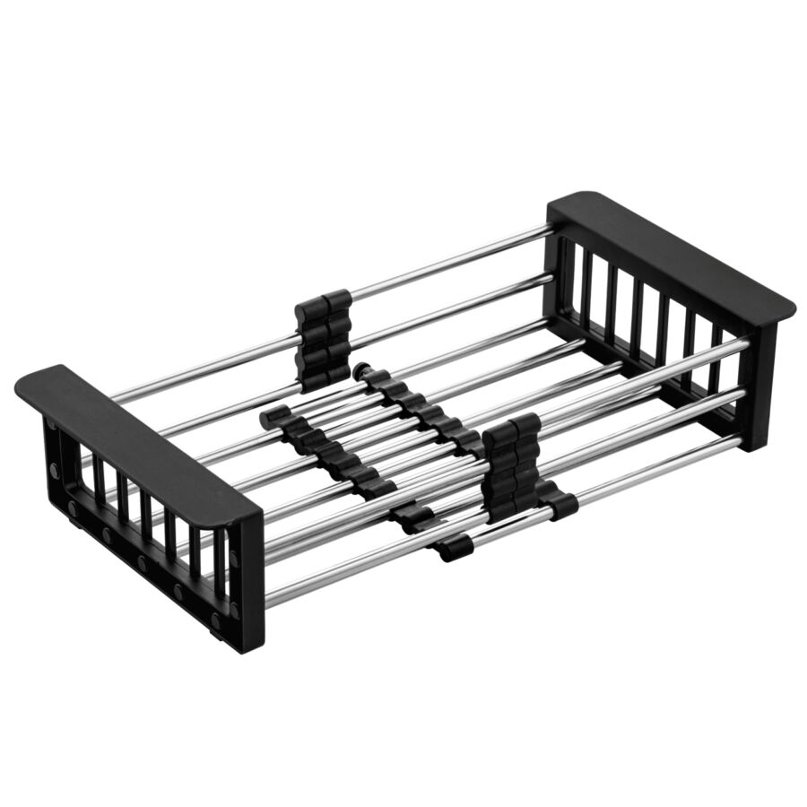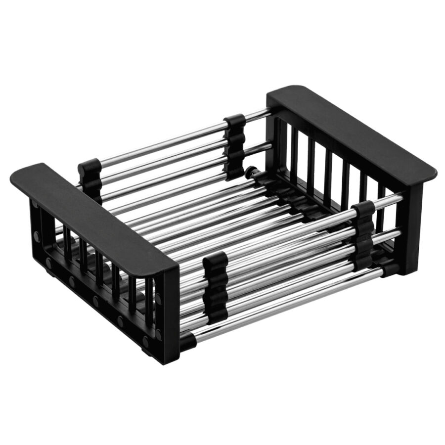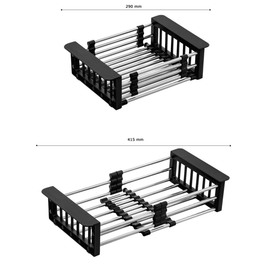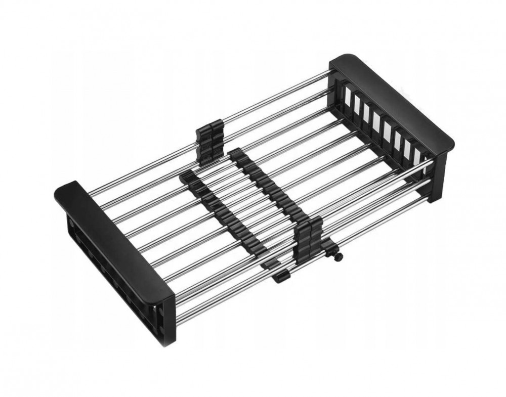 Gamma gyümölcsszárító állítható szélességgel, szögletes mosogatóra helyezhető. Gyümölcsmosóként, tárolóként és edényszárítóként is tökéletesen használható, anyaga rozsdamentes acél csúszásmentes PVC végekkel. Gamma gyümölcsmosó, szárító, állítható, fekete