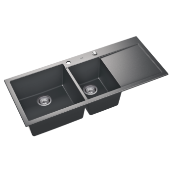 A-POINT 180 kétmedencés csepegtetőtálcás gránit mosogató automata dugóemelő, szifonnal, szürke, balos, beépíthető