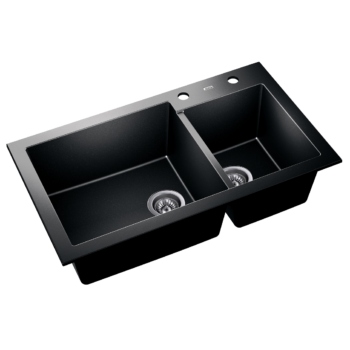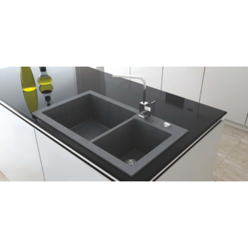 A-POINT 140 kétmedencés gránit mosogató automata dugóemelő, szifonnal, fekete-szemcsés fényes, beépíthető