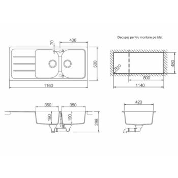 SCHOCK Formhaus D-200 Cristalite Nero kétmedencés csepegtetőtálcás gránit mosogató, szifonnal, fekete, beépíthető
