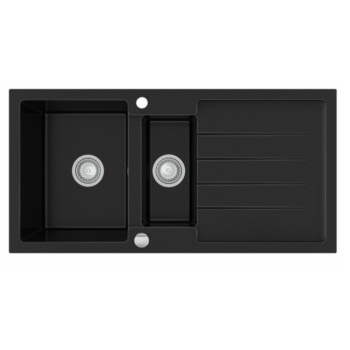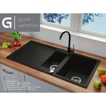 NEXT2 másfél medencés gránit mosogató automata dugóemelő, szifonnal, fekete, beépíthető