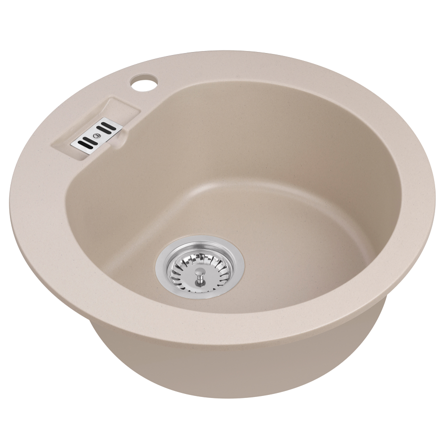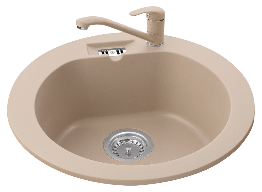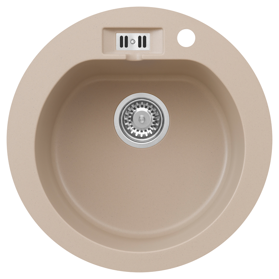 MALIBU 10 egymedencés kör alakú gránit mosogató, csepptálcás kivitelben, extra mély medencével, fekete-szemcsés, fekete, bézs, fehér és szürke színekben. Jobbos és balos kivitelben is használható. A MALIBU 10 egymedencés kör alakú gránit mosogató min. 50 cm széles szekrénybe építhető be.