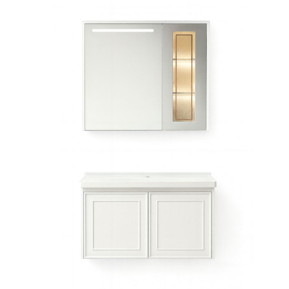 Stílusos fürdőszobabútor szett, amely ötvözi a modern dizájnt a praktikus megoldásokkal. A világos, minimalista forma tökéletesen illik mind a modern, mind a klasszikus fürdőszobai belső terekhez.