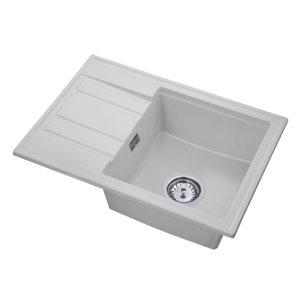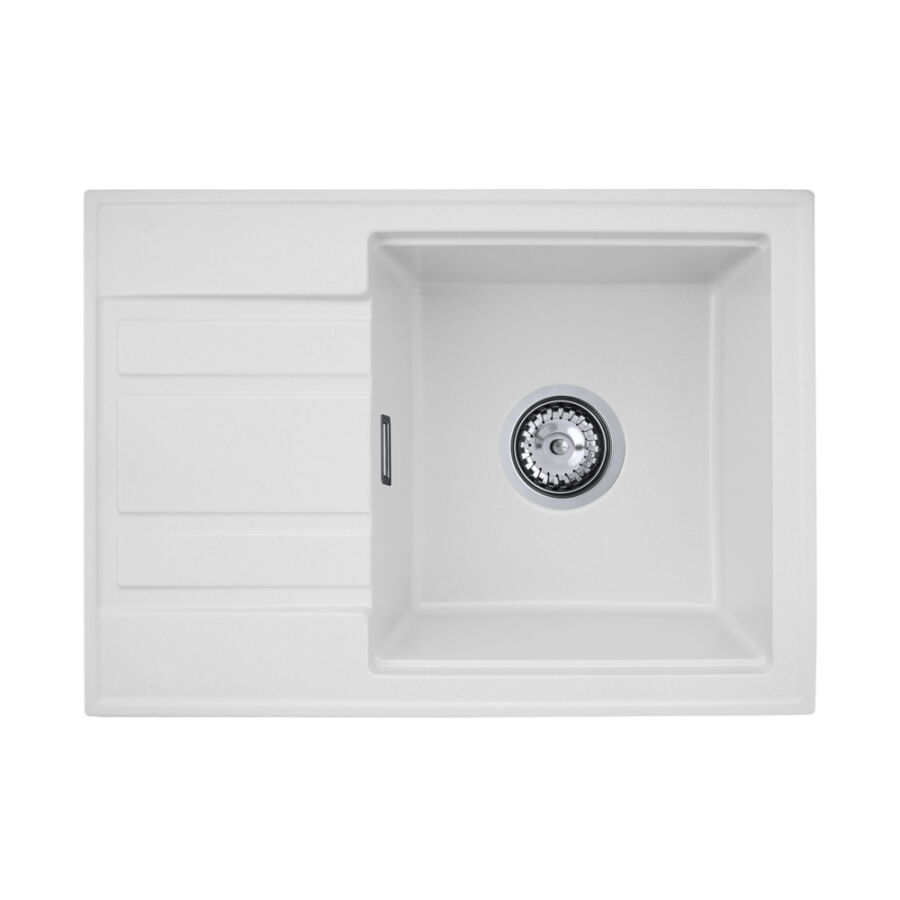 Modern 6040 csepegtetőtálcás egymedencés gránit mosogató, manuális szifonnal, fehér színben