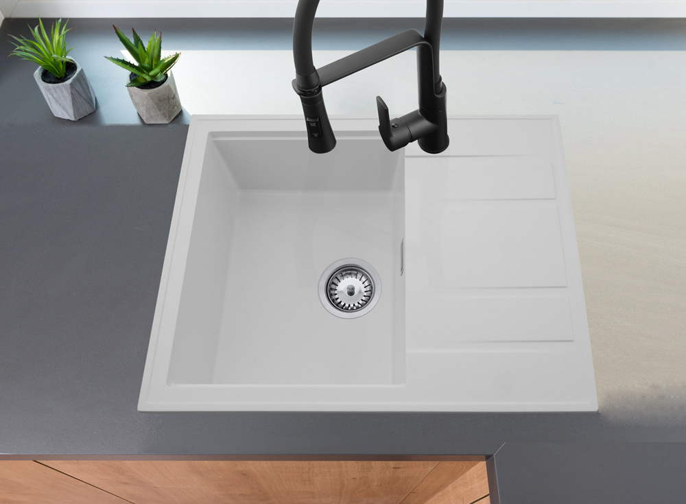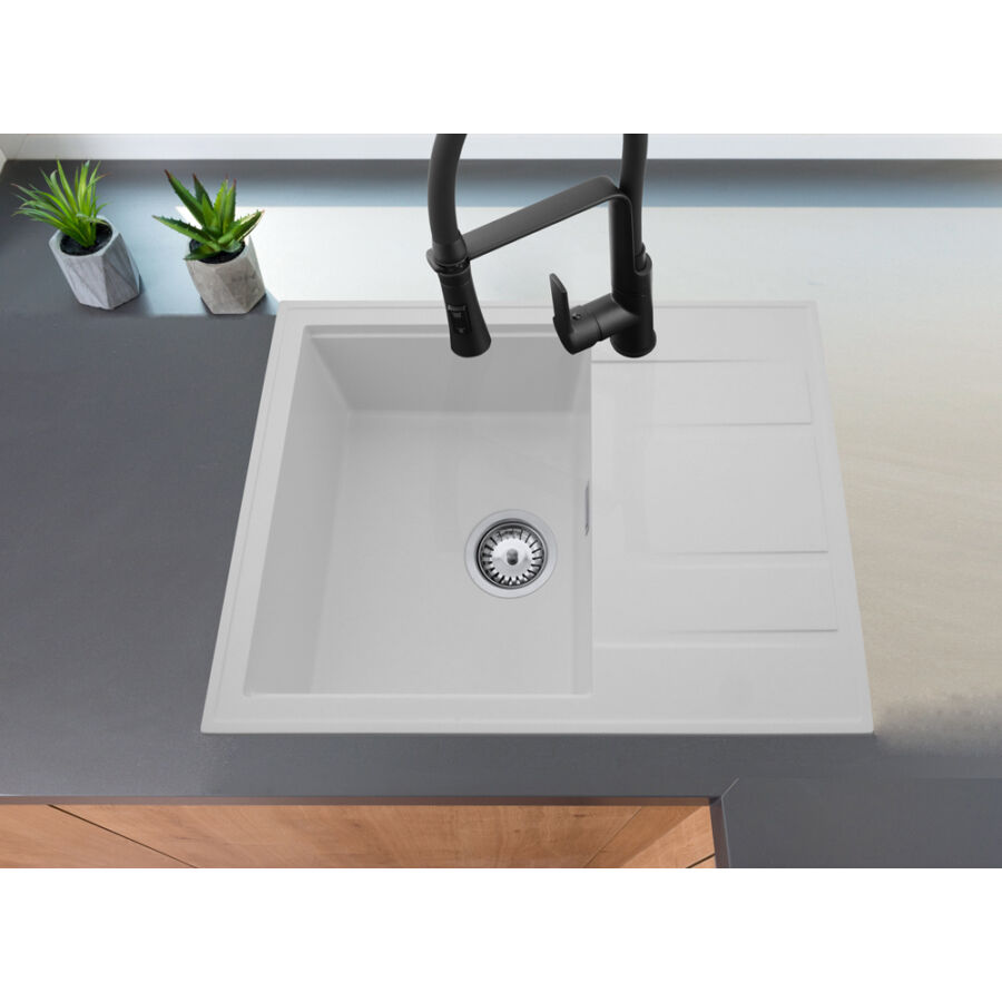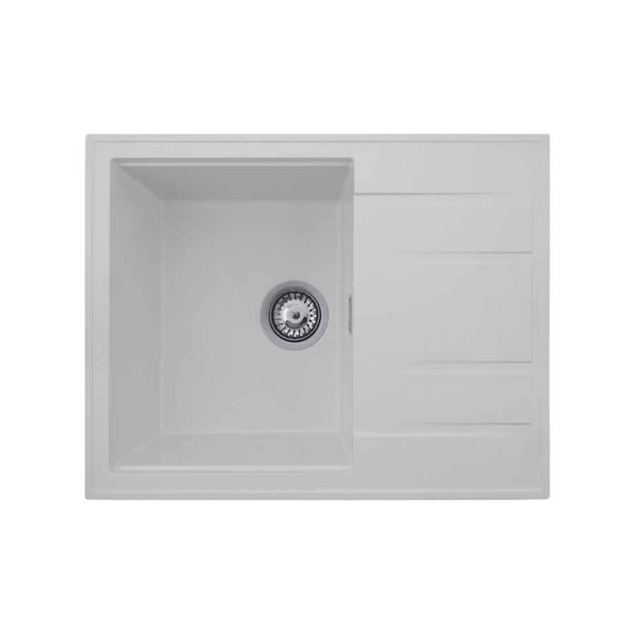 Modern 6550 csepegtetőtálcás egymedencés gránit mosogató, manuális szifonnal, fehér, beépíthetőParaméterek