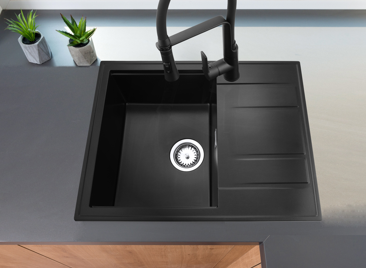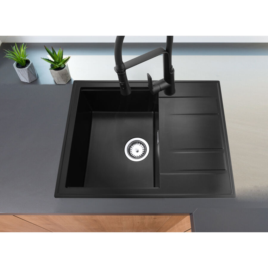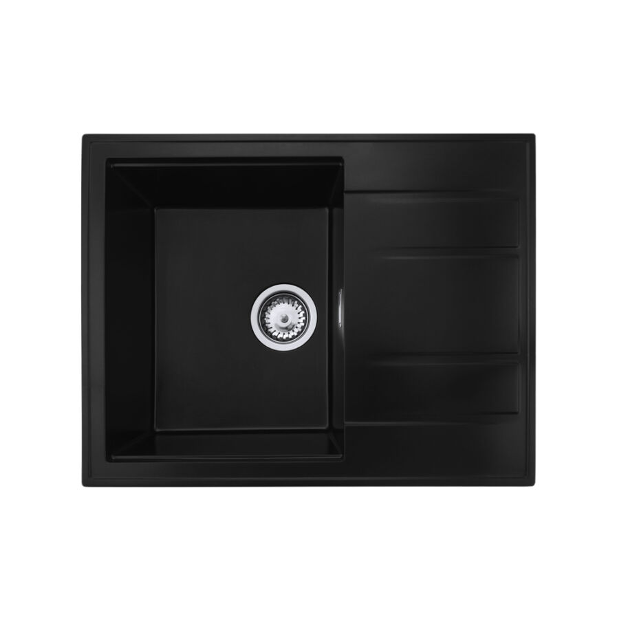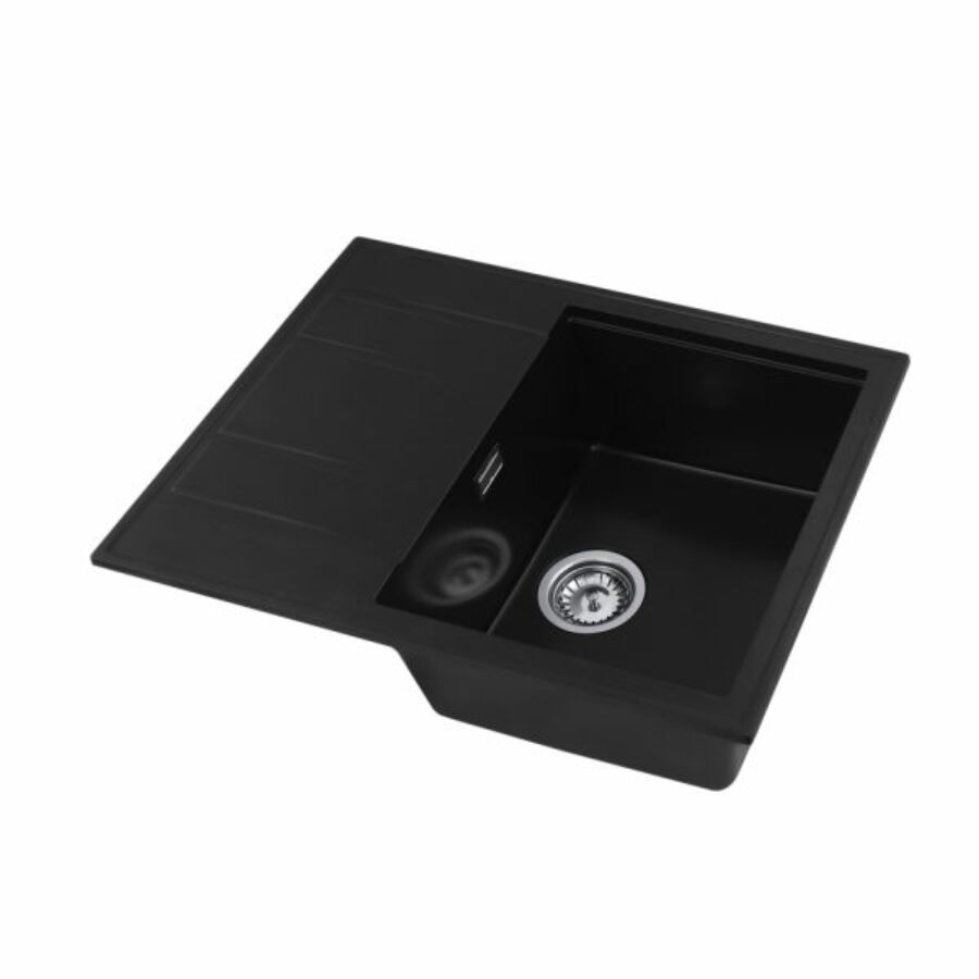 Modern 6550 csepegtetőtálcás egymedencés gránit mosogató, manuális szifonnal, fekete-szemcsés, beépíthetőParaméterek