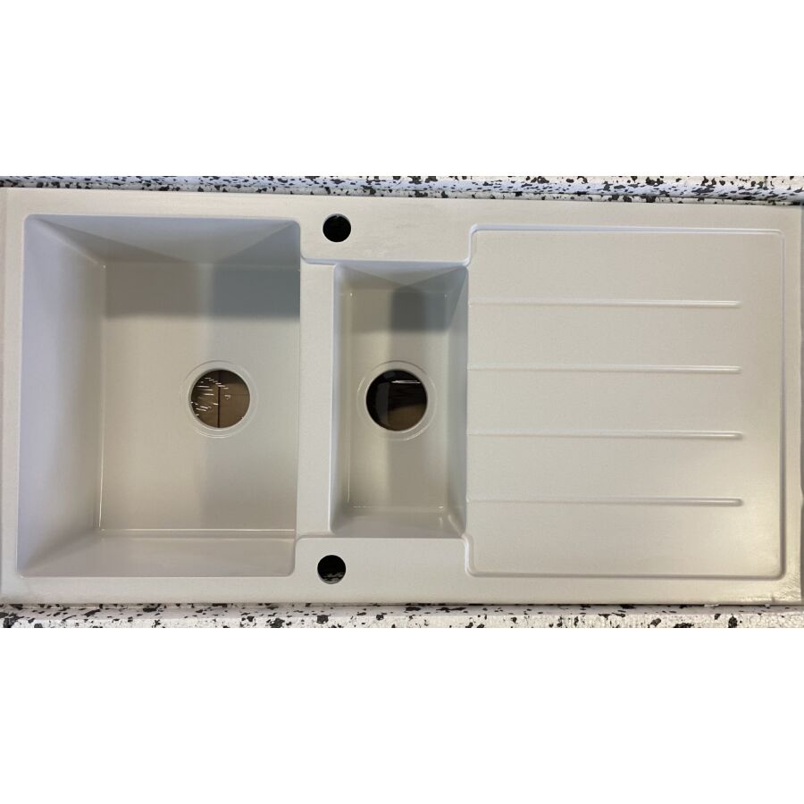 NEXT2 másfél medencés (gyümölcsmosós) gránit mosogató, csepptálcás kivitelben, extra mély medencével, fekete, fehér, fekete-szemcsés, bézs-szemcsés, és szürke színekben. Jobbos és balos kivitelben is használható. A NEXT2 másfél medencés (gyümölcsmosós) gránit mosogató min. 60 cm széles szekrénybe építhető be.