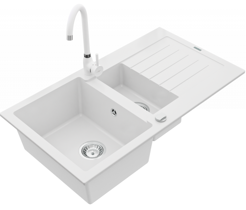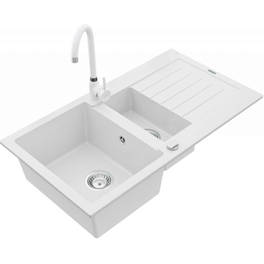 NEXT2 másfél medencés mosogató szett 2 féle választható csapteleppel (Beta, Steel) automata szűrőkosaras leeresztővel, szifonnal fehér színben, beépíthetőParaméterek