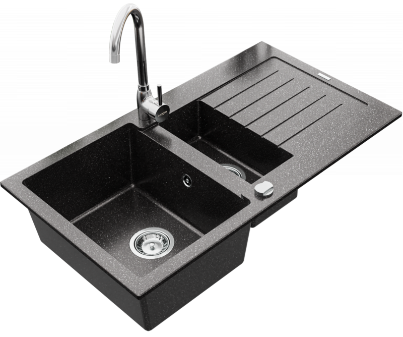 NEXT2 másfél medencés mosogató szett 2 féle választható csapteleppel (Beta, Steel) automata szűrőkosaras leeresztővel, szifonnal fekete-szemcsés színben, beépíthető