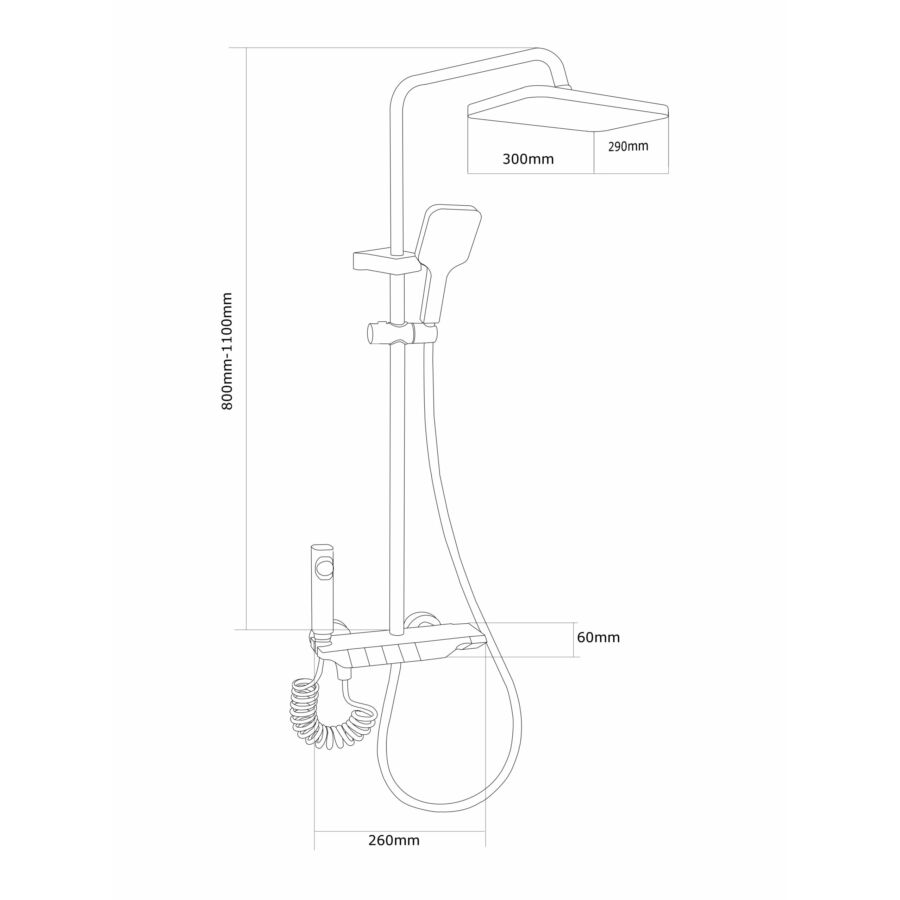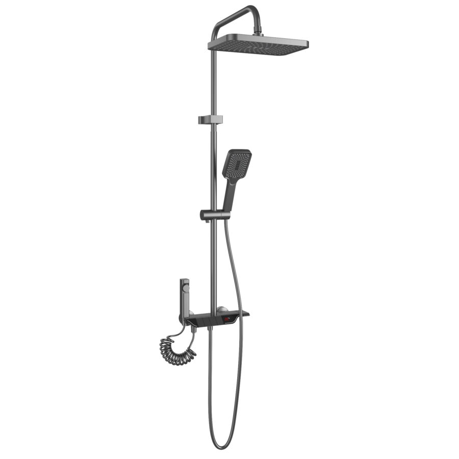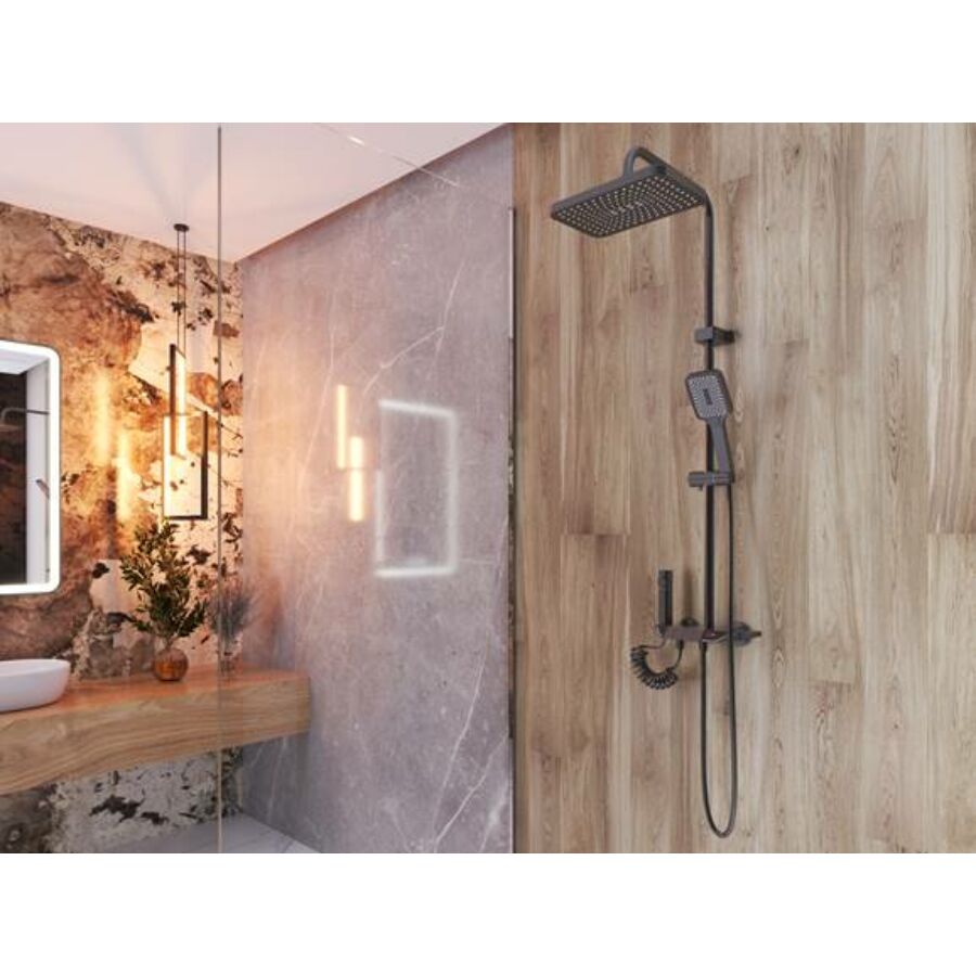 Modern zuhanyszett matt szürke kivitelben, amely tökéletesen illik bármely fürdőszobába. A készlet tartalmaz: széles fejzuhanyt, ergonomikus kézizuhanyt tömlővel, állítható zuhanyrudat, valamint termosztatikus csaptelepet hőmérséklet-kijelzővel.
