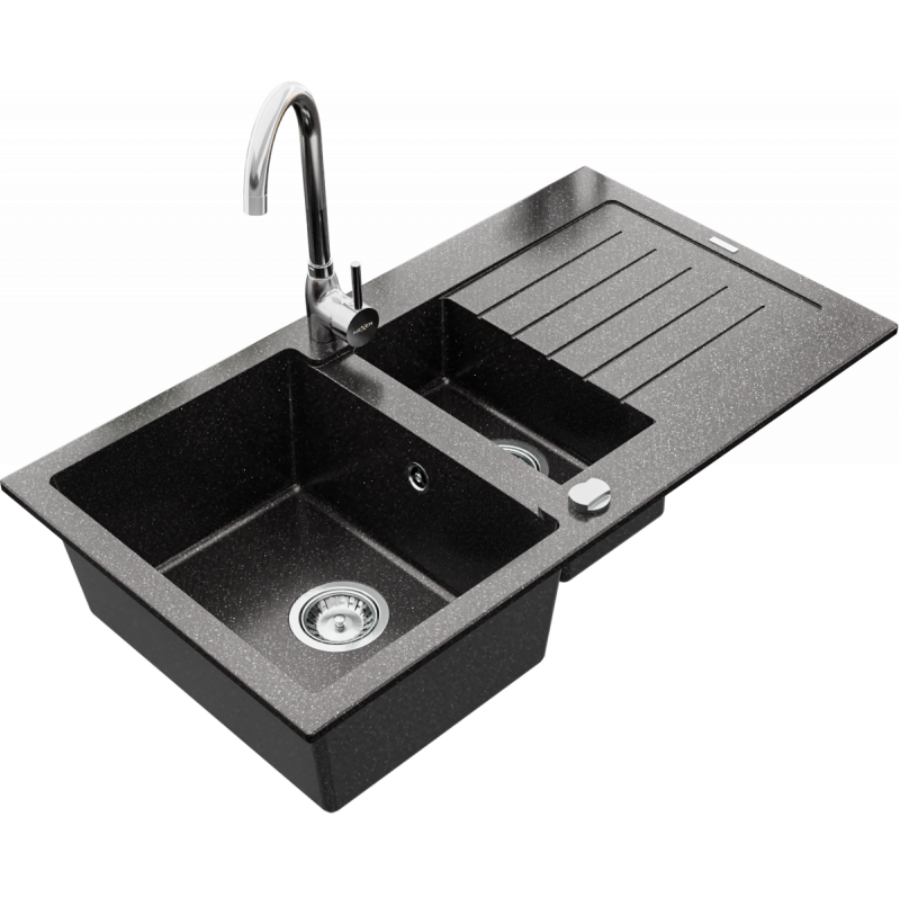 Ezt a népszerű gránit mosogatótálcát csepptálcás extra felülete és különösen mély medencéje teszi olyan egyedivé. A képen látható fekete szemcsés szín mellett elérhető még fekete, fehér, bézs-szemcsés, és szürke színekben. Jobb és balkezes kivitelben is használható. A NEXT2 másfél medencés (gyümölcsmosós) gránit mosogató minimum 60 cm széles szekrénybe építhető be.