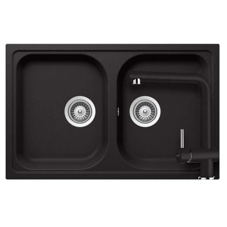 A NEXT2 gránit mosogatótálca csapteleppel kapható, mely színben illik a fekete szemcsés felülethez. A választható csaptelepek különböző dizájnban (kerek, szögletes és kissé hajlított) érhetőek el.