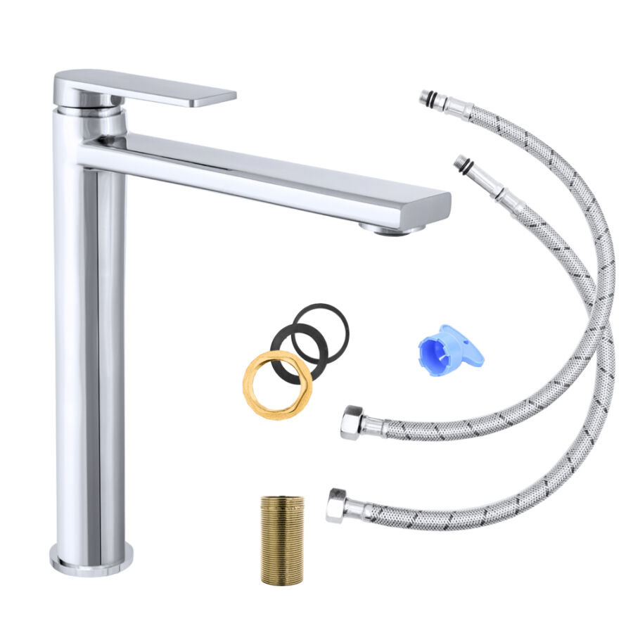 A csomag tartalma: csaptelep, bekötő csövek, tömítések, minden szerelvény, ami a bekötéshez szükséges