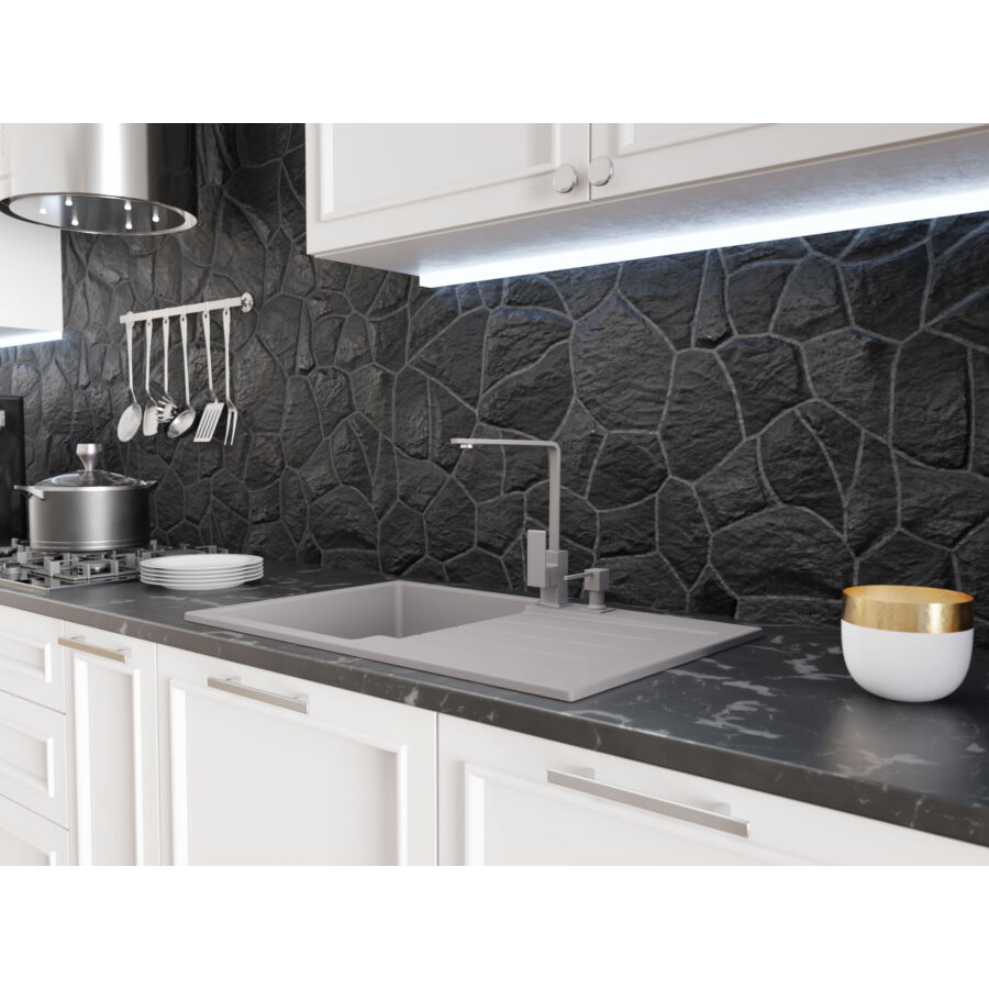 ROXY egymedencés gránit mosogató csepptálcás kivitelben, extra mély medencével, fekete-szemcsés, fekete, bézs, fehér és szürke színekben. Jobbos és balos kivitelben is használható. A ROXY egymedencés gránit mosogató csepegtető tálcával min. 50 cm széles szekrénybe építhető be.
