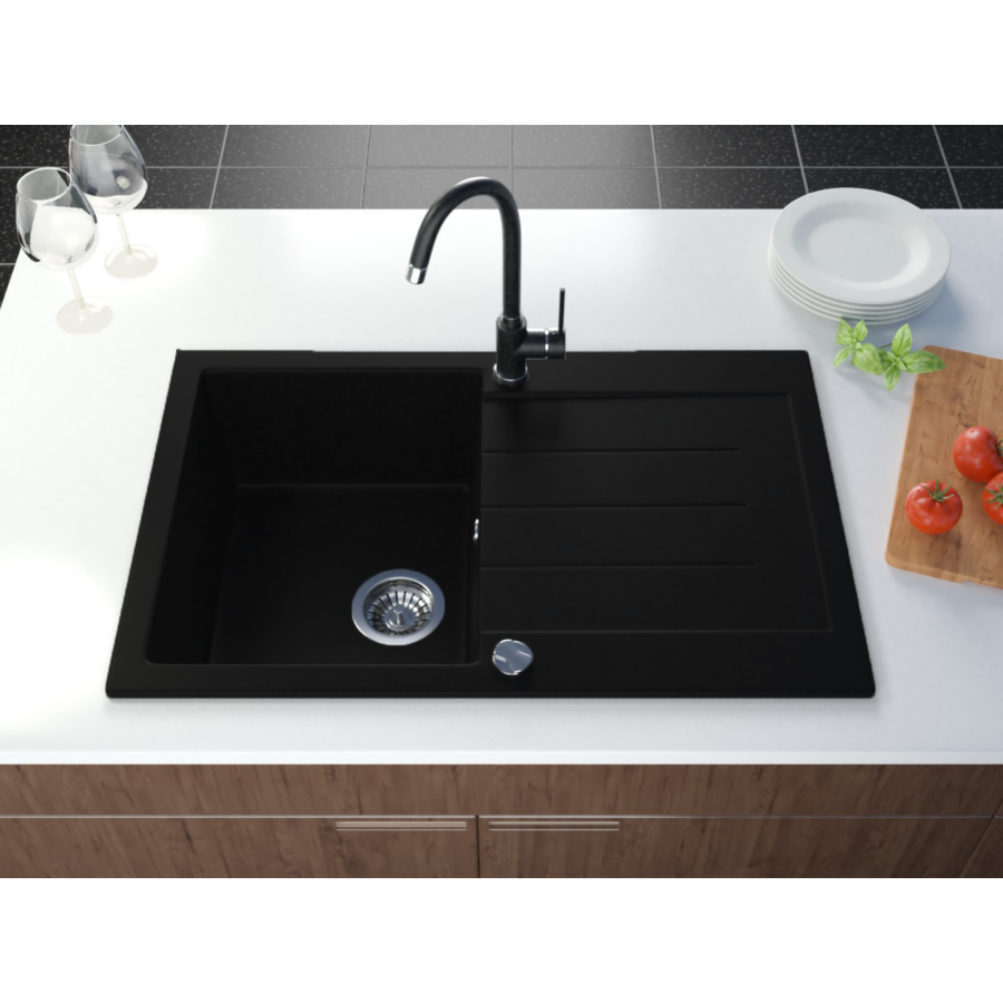 ROXY egymedencés gránit mosogató csepptálcás kivitelben, extra mély medencével, fekete-szemcsés, fekete, bézs, fehér és szürke színekben. Jobbos és balos kivitelben is használható. A ROXY egymedencés gránit mosogató csepegtető tálcával min. 50 cm széles szekrénybe építhető be.
