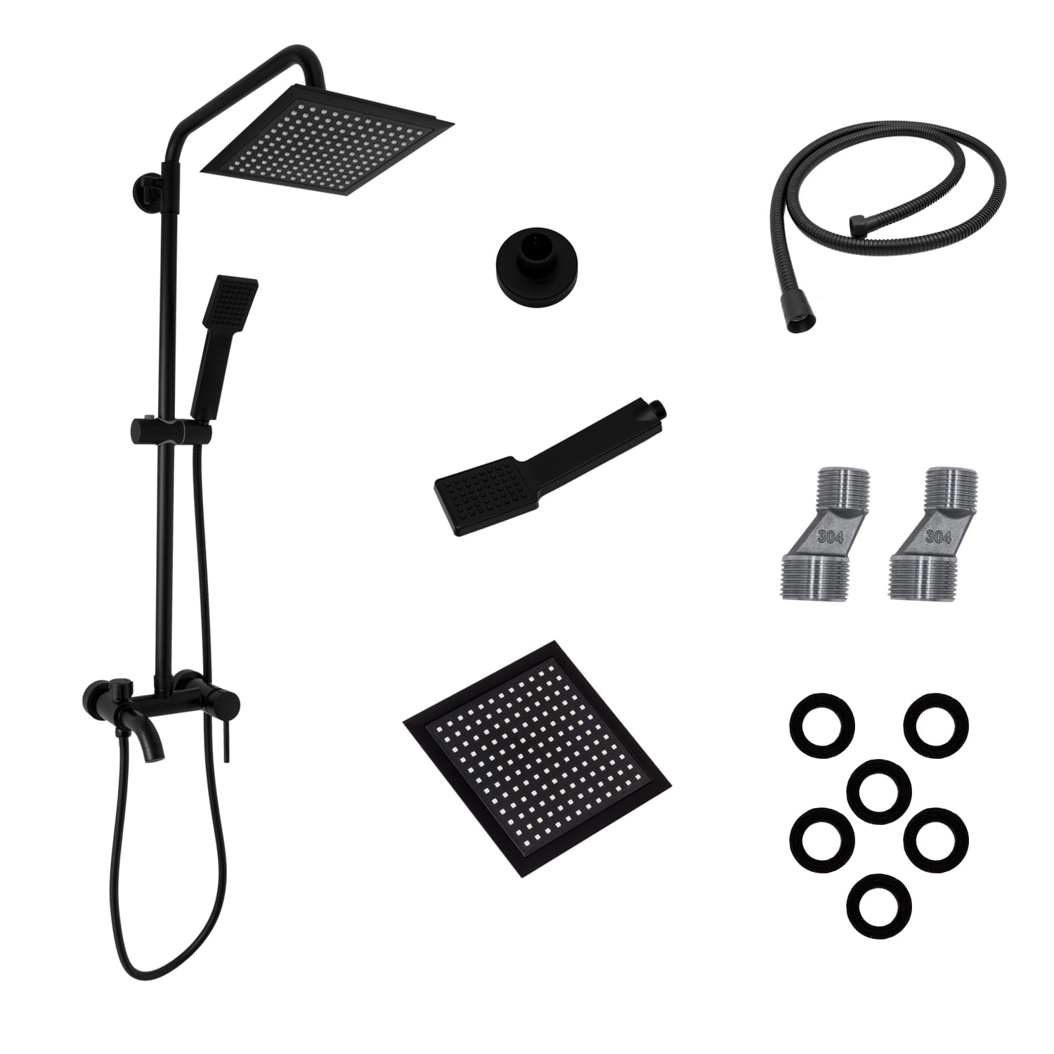 A csomag tartalma: esőztető zuhanyfej, kézi zuhanyfej, fali rögzítő elem, tömítések, zuhany- és elemcsatlakozó tömlő, zuhanykapcsoló, minden szerelvény, ami a bekötéshez szükséges