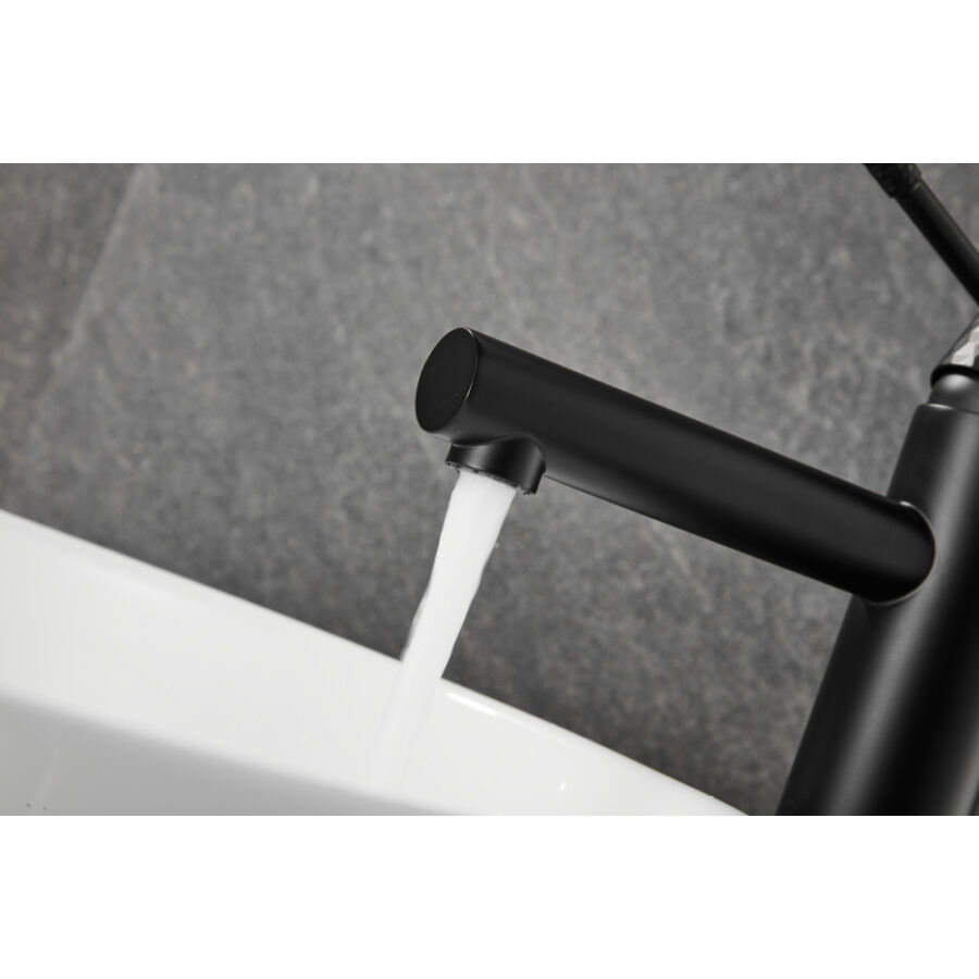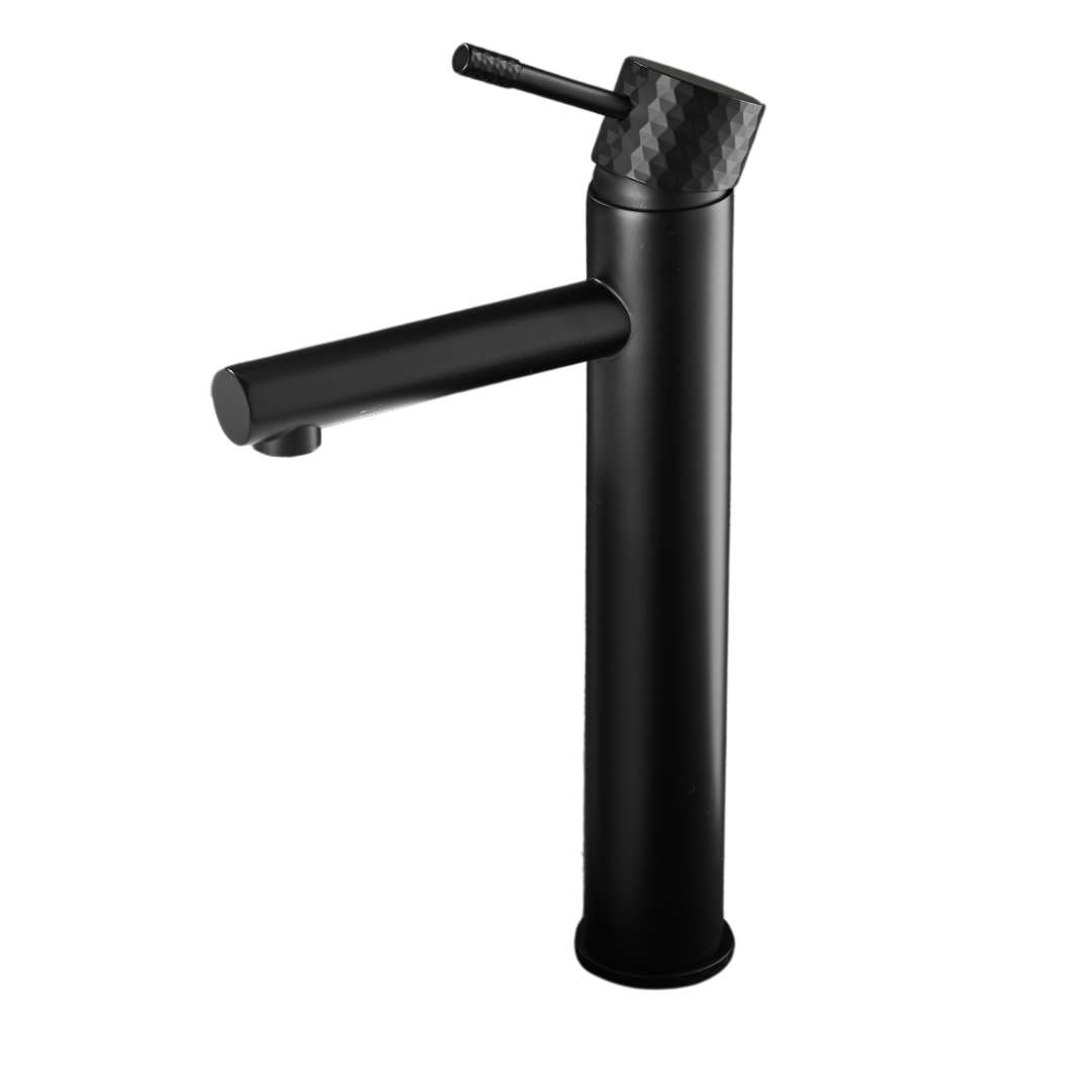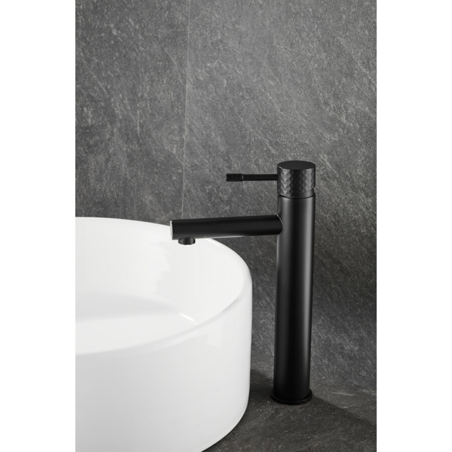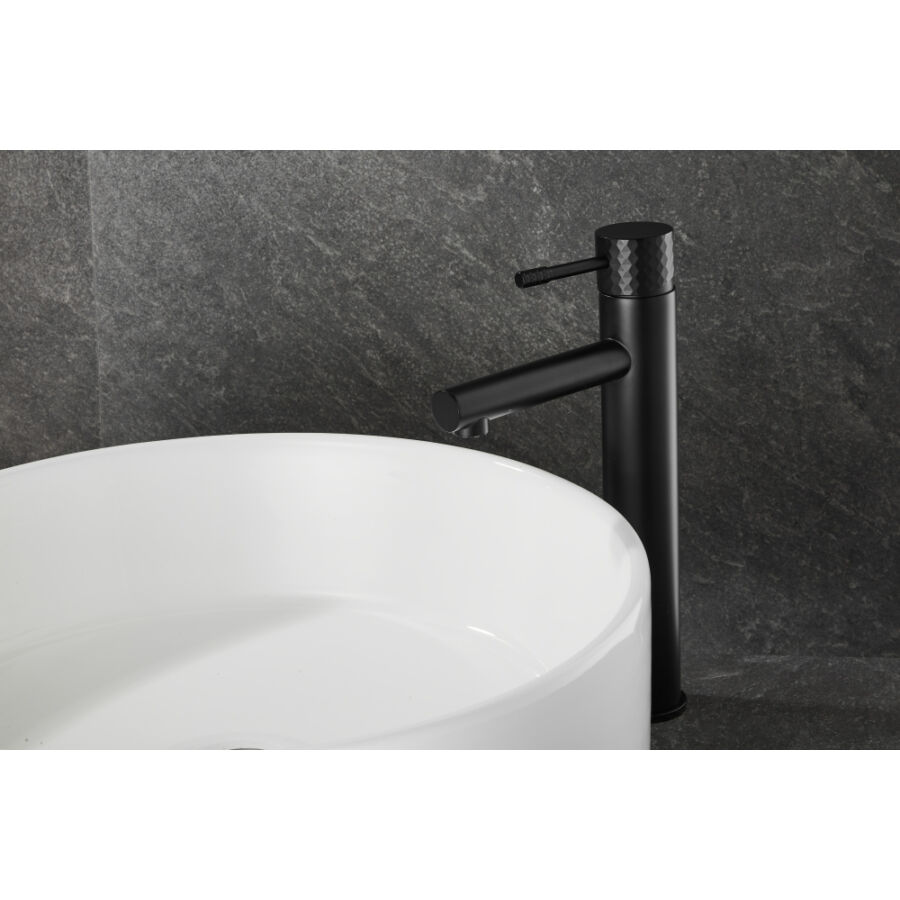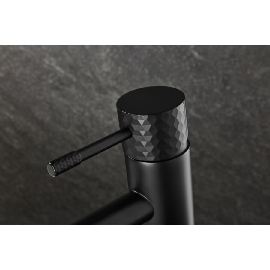 A Roy Pro magas mosdócsaptelep elegáns matt fekete kivitelben tökéletes megoldás a modern fürdőszobákba, különösen pultra szerelhető mosdókagylókkal párosítva. Kiváló minőségű sárgarézből készült, tartósságot, korrózióállóságot és hosszú élettartamot biztosít. A gomb jellegzetes gyémántcsiszolt felülete egyedi stílust és exkluzív karaktert kölcsönöz.