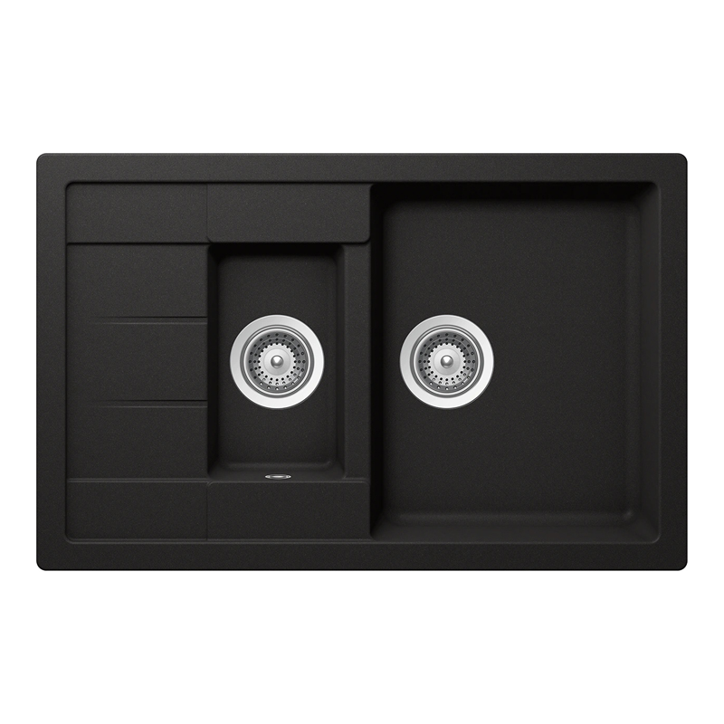 Schock Manhattan D-150S konyhai mosogatótálca Cristalite Nero 780 x 500 mm, gránit, megfordítható, hagyományos beépítés, fekete munkalapba beépíthető, egy + félmedencés, csepegtetővel ellátott, megfordítható, ideálisan illeszkedik a minimum 60 cm-es alsószekrényhez. A csaptelep helye előre elkészített, könnyedén áttörhető. A csomagban találja a használati útmutatót, amely részletes leírást ad a csaptelep helyének megfelelő módon történő áttöréséről. A csaptelep helyét átlyukaszthatja gyémántfúró segítségével, amit külön vásárolhat meg, vagy akár kalapáccsal is egy egyszerű mozdulattal. A mosogató rendkívül tartós CRISTALITE® anyagból készült - ez a forradalmi anyag majdnem háromszor erősebb a gránitkőnél, ezért ellenáll bármely sokkhatásnak. Mindemellett, a CRISTALITE® felület SCHOCK proHygienic21 technológiát használ, amely hőálló, élelmiszerbarát, ugyanakkor könnyen tisztítható és könnyű karbantartani. Praktikus modell, melynek egyik medencéje 20 cm mélységű, a másik, 15 cm-es medence ideális a zöldségek és a gyümölcsök előkészítésére, tisztítására. Emellett, mind a hat elérhető árnyalat színnel és élettel tölti meg konyháját. A csomag lefolyógarnitúrát (mosogatógép vagy mosógép csatlakozással), szűrőkosaras lefolyót és rögzítőkapcsokat tartalmaz.