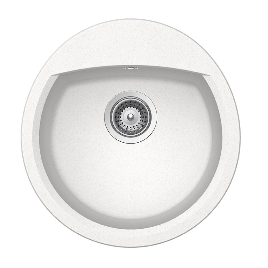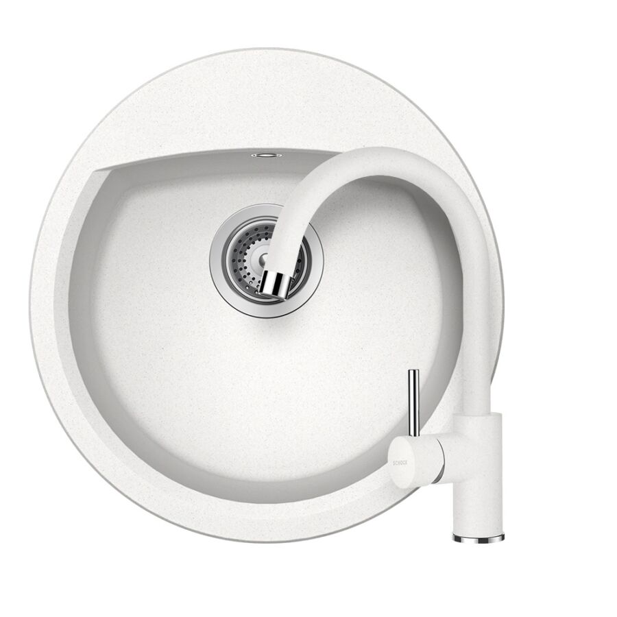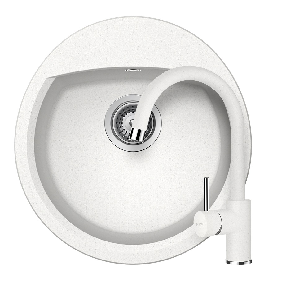SCHOCK Manhattan R-100 Cristalite Alpina egymedencés kerek gránit mosogató szett, Schock Plutos konyhai csaptelep, fehér, beépíthetőParaméterek
