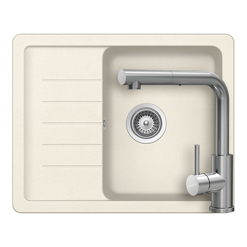 Schock Pinedo D-100XS konyhai mosogatótálca 620 x 500 mm Cristalite Vanilla, világos bézs és Schock Kantus konyhai csaptelep kihúzható fejjel rozsdamentes acél, beépíthető
