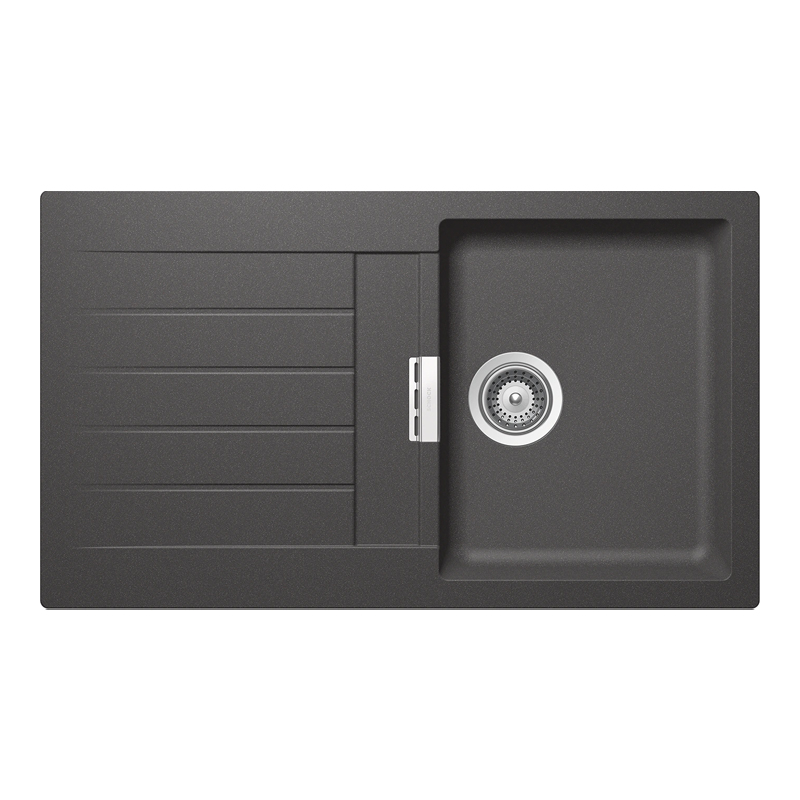 Schock Signus D-100 konyhai mosogatótálca Cristadur Stone 860 x 500 mm, gránit, megfordítható, hagyományos beépítés, palaszürke munkalapba beépíthető, egymedencés, csepegtetővel ellátott, ideálisan illeszkedik a minimum 45 cm-es alsószekrényhez. A mosogatótálca megfordítható, a csaptelep helye előre elkészített, könnyedén áttörhető. A csomagban találja a használati útmutatót, amely részletes leírást ad a csaptelep helyének megfelelő módon történő áttöréséről. A csaptelep helyét átlyukaszthatja a gyémántfúró segítségével, amelyet szállításkor mellékelünk a termékhez. Ezt a modellt az egyedülálló CRISTADUR® termékanyag teszi kimagaslóvá, amely kitűnik sűrű felülete által, rendkívül higiénikus, nem engedi a szennyeződést vagy a baktériumokat megtelepedni a mosogató felületén, ezáltal könnyű tisztán tartani. Dizájnját erősíti, hogy klasszikus vonalai elenganciát sugároznak, így a mosogató hangsúlyosan modern. A csomag lefolyógarnitúrát (mosogatógép vagy mosógép csatlakozással), szűrőkosaras lefolyót, rögzítőkapcsokat és gyémántfúrót tartalmaz.