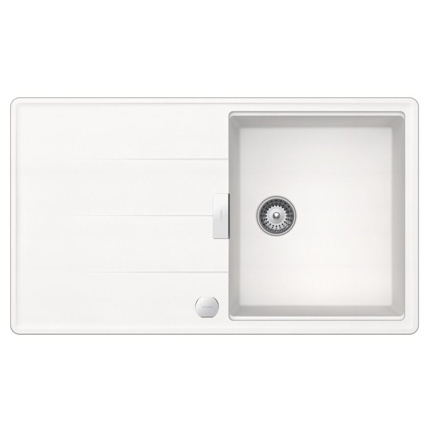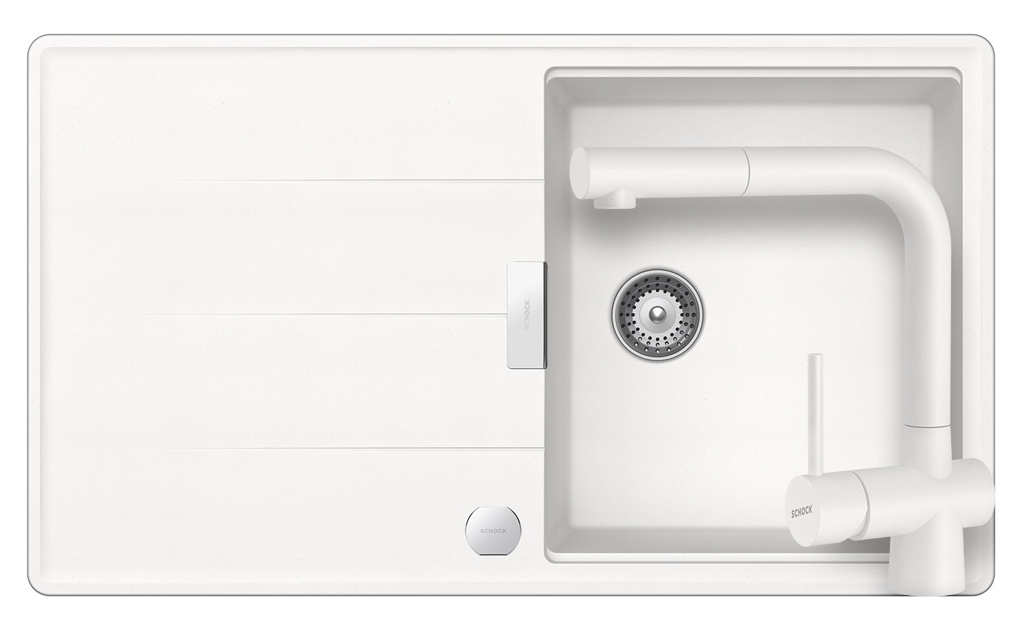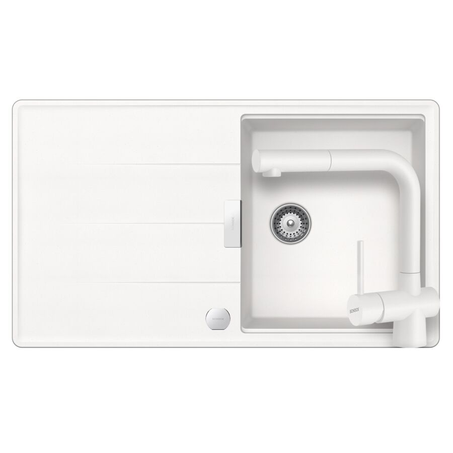 SCHOCK TIA D-100 Cristadur Polaris gránit mosogató szett automata szűrőkosaras leeresztővel, szifonkészlettel, csepegtető tálcával, fehér színben, Schock Laios Ext konyhai csaptelep Cristadur Polaris kihúzható fejjel, fehér színben