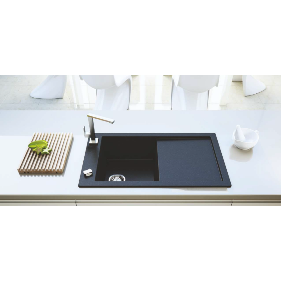 TRAMONTANA egymedencés gránit mosogató csepptálcás kivitelben, extra mély medencével, fekete-szemcsés, fekete, bézs, fehér és szürke színekben. Jobbos és balos kivitelben is használható. A TRAMONTANA egymedencés gránit mosogató csepegtető tálcával min. 50 cm széles szekrénybe építhető be.